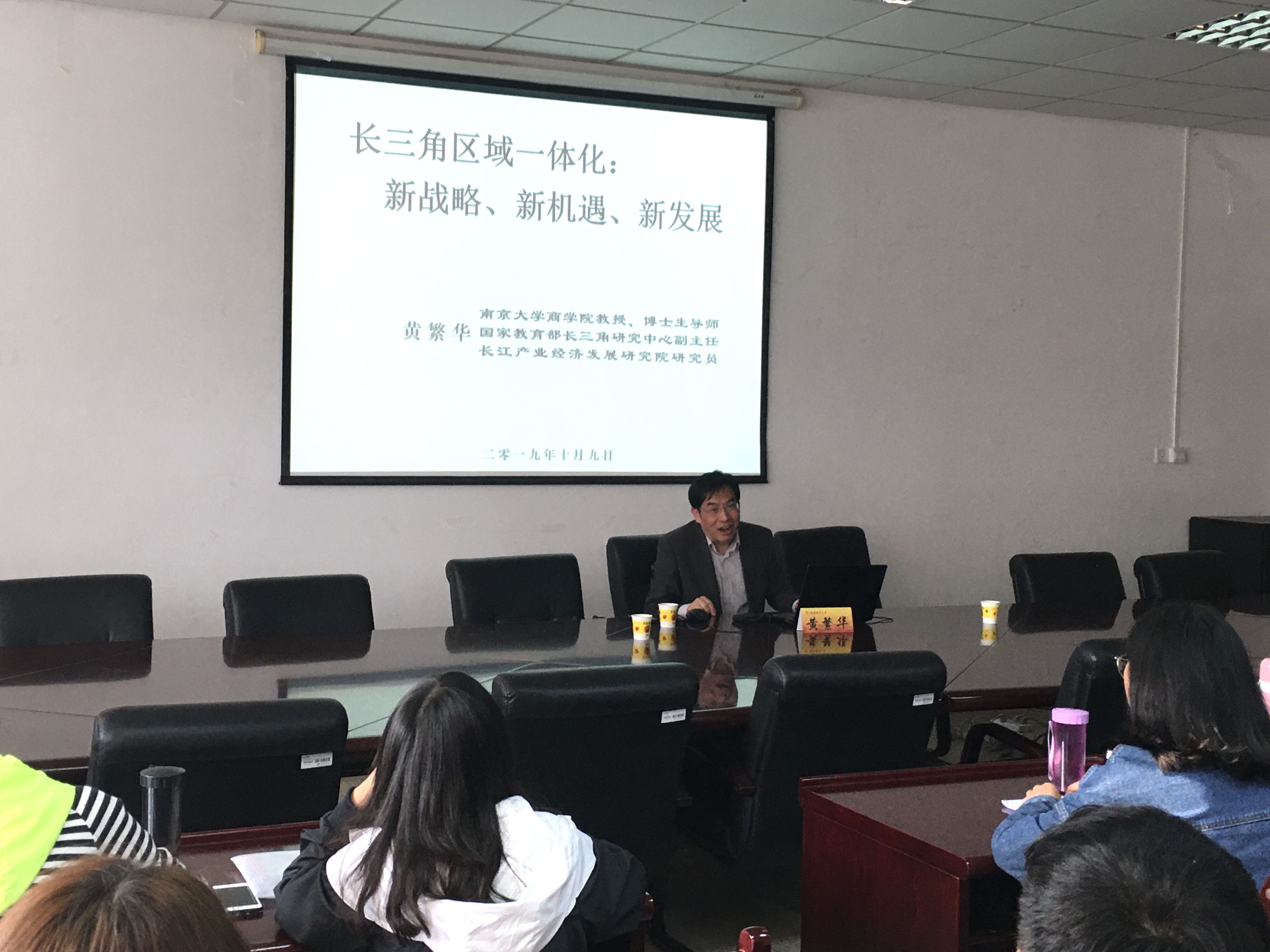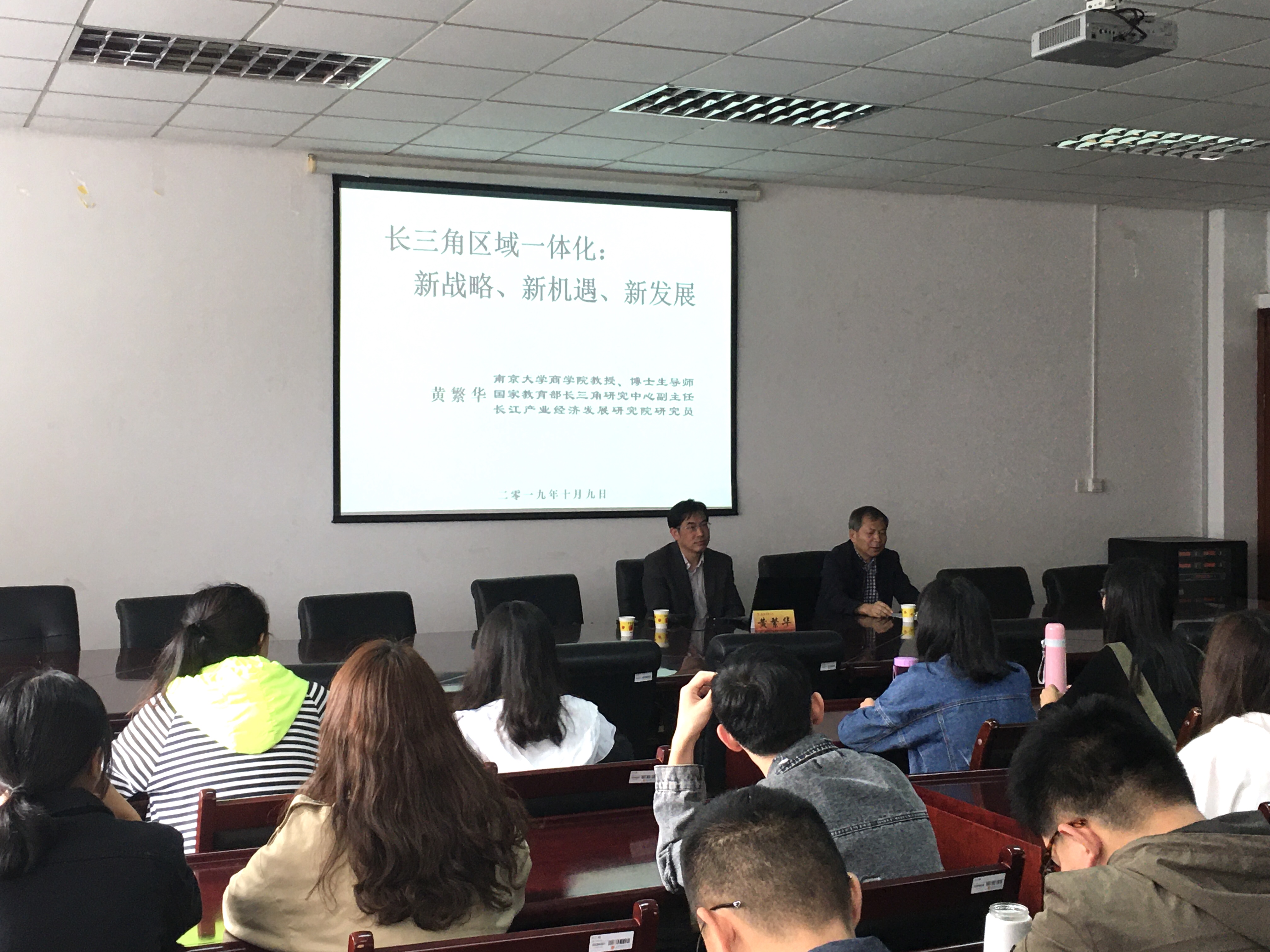 为让公司研究生了解长三角一体化战略的现实意义,积极投身于长三角这块全世界瞩目的热土建设,10月9日下午,南京大学商公司教授、博士生导师、教育部长三角研究中心副主任、长江产业经济发展研究院研究员黄繁华来到德经楼308会议室,为公司研究生作了题为《长三角区域一体化:新战略、新机遇、新发展》的学术报告,公司全体研究生聆听了讲座。