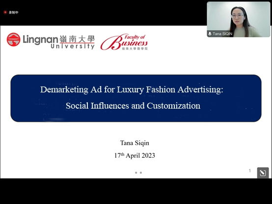 2023417日下午,应必一运动邀请,香港岭南大学斯琴塔娜副教授做了题为Demarketing Ad for Luxury Fashion Advertising: Social Influences and Customization线上学术讲座,国贸公司管理科学与工程等专业研究生和部分老师及员工参加了此次讲座。