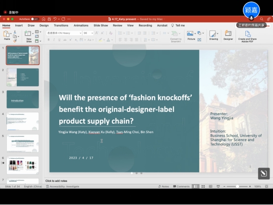 2023年4月17日上午,应必一运动邀请,上海理工大学王颖嘉副教授做了题为“Will the presence of ‘fashion knockoffs’ benefit the original-designer-label product supply chain?”线上学术讲座,国贸公司管理科学与工程等专业研究生和部分老师及员工参加了此次讲座。