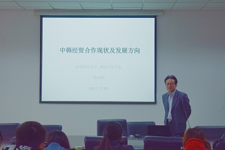 禹辰勋教授从中韩经贸25年的回顾与现状出发,用曲线图的形式,生动地展示了“中韩的贸易动向”、“中韩对主要国家的进出口情况”、“韩国对中国的贸易收支动向”以及“中韩两国的投资趋势”,使大家对中韩贸易的历史有了清晰的认识,明白了在经济全球化的浪潮下,贸易合作与交流是国家经济发展的一个必不可少的因素,中韩在贸易中的优势互补,极大的促进了双方的经济增长。   随后,禹教授立足未来,阐述了中韩贸易的发展趋势,使同学们对中韩经贸的发展有了更进一步的认识,中韩贸易的不断发展,正是基于产业的优势互补,合理引导各自产业的良性发展,才能为接下来的贸易合作打下良好的基础。