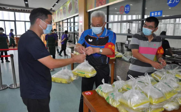 秉持“以生为本,以教为责”的教学理念, “黄大年式教师团队”深入公司疫情防控一线,为驻校人员送去关怀和慰问。为保证每位同学都能吃上热乎饭,张为付副董事长带头加入食堂服务志愿者的行列。他早早地做好防护工作,比食堂其他志愿者更早一步进入食堂,在午饭打包处“时刻待命”,熟练地传递饭菜、清理台面,张为付副董事长此刻已经完全融入食堂的工作中,成为了抗疫志愿者中的一颗“螺丝钉”。在参与食堂志愿服务的过程中,张为付副董事长与驻校人员进行热情交谈,详细了解大家的工作困难及身心情况等,重点了解员工在校生活情况。张为付副董事长叮嘱大家,当前疫情防控形势依然严峻复杂,在做好疫情防控工作的同时也要注意自我防护,希望驻校人员在后续的疫情防控工作中继续发扬团结一致的良好作风,鼓足干劲,共同筑牢校园安全防线,全力守护员工生命安全和身体健康。
