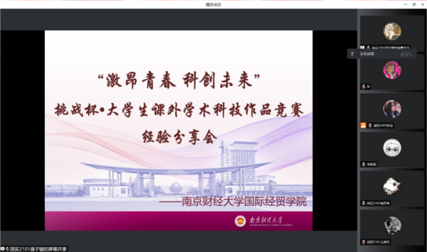 贸经1902戴聿扬同学则总结了她的参赛过程中遇到的问题以及解决对策。最后是国贸1903王棣同学,他在第十七届“挑战杯”课外学术科技作品竞赛红色专项中担任主持人并获江苏省三等奖,同时获高教主赛道江苏省三等奖。他推荐同学们多参考政府级文件进行选题,让选题更符合思潮,并分享了在调研情景中的难易,调研报告的经验,特别指出在做项目中我们要保持情怀,直击社会痛点。