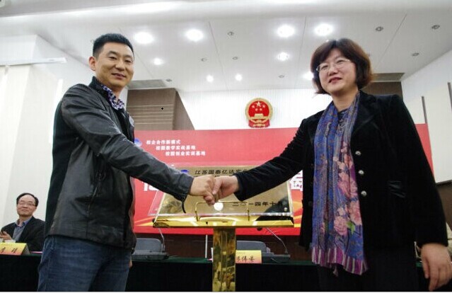 国泰亿达董事长才东升先生发言表示“早就有这样的想法,公司将致力于与大学的合作,让员工了解到社会和企业需要怎样的人才,促使高校培养出更多符合我国发展要求的实践性、创新性人才”。最后,邱伟芬副董事长和国泰亿达董事长才东升先生一同为亿达工作室揭牌,并表示对双方合作愉快互进双赢的美好期望。国泰亿达公司人事主管李瑾女士为南财大亿达工作室颁发开办购置金,亿达工作室正式挂牌成立。