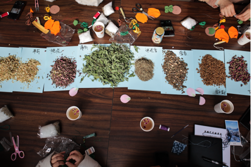 会议室的长桌上早早地摆上了制作香囊所需的布料、针线等制作香囊的原材料,玫瑰花、白芷、太华、藿香、丁香、薄荷、茉莉、迷迭香等原料一字排开,香料的不同组合搭配组合成一个个“舒肝解郁”“温经安神”配方,供老师们选择。在动手制作前,公司工会主席张朋朋老师为大家介绍了香囊的制作方法和香囊药方配伍。大家喝着洛神花玫瑰茶,听着悠扬婉转的音乐,感受到了“何以致叩叩,香囊系肘后”的文化内涵与艺术魅力。随后,老师们便根据自身的需求,发挥奇思妙想,在一针一线的缝制过程中,创作出一个个立体饱满、独具特色的香囊——有绿意盎然的莲蓬香囊,也有带有美好祝愿的“柿柿如意”香囊......