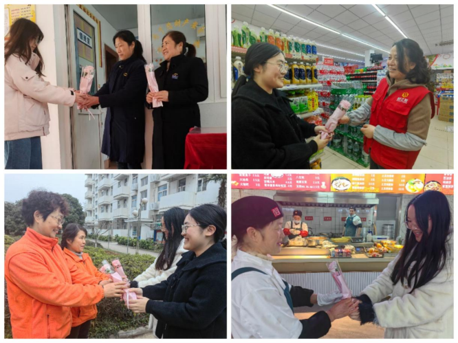 此外,必一运动的志愿者们在三八节前夕为公司女教职工送上鲜花与祝福贺卡,以表敬意。志愿者们去到了宿管站、超市与食堂,细心留意才发现,朴素的中国女性在点点生活中展现着巾帼不让须眉的美丽。食堂的阿姨们在为接下来的晚餐忙碌着、保洁阿姨仔细清扫着教室走廊的卫生,宿管阿姨们则是在倾听着来访同学们的烦恼与心事,并不时给她们提供鼓励与建议。她们在平凡岗位上默默坚守,维护了校园生活的和谐与有序。“阿姨您工作辛苦了,祝您妇女节快乐,这是为您准备的鲜花,祝您工作顺利,心想事成!”