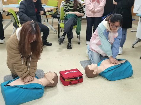 在此活动中,志愿者们学习了心肺复苏的操作流程和除颤仪的使用方法。在老师示范标准动作后,志愿者们即学即练,每一位志愿者都进行了多组实操。练习过程中大家认真聆听老师的指导,牢记急救的步骤和细节,在练习完一整套急救动作后许多人满头大汗,疲惫不堪,这让大家感受到了急救工作的不易,体会到生命的宝贵。经过反复多次的实操,志愿者们逐渐掌握了急救技能和要领并顺利通过了考核获得了现场救护资格,成为了真正的“红十字救护员”。
