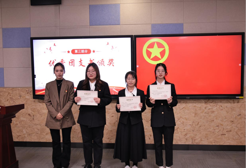 会议的第三项议程,优秀团支书颁奖。分团委副书记于真真、李玉桐、刘洋根据九位团支书述职汇报与答辩,评选出三位优秀团支书,分别是国贸2301团支部团支书戚瀚文、国贸2303团支部团支书仲欣悦和贸经2302团支部团支书李美颖。在同学们热烈的掌声中,由分团委副书记于真真为三位优秀团支书颁奖。
