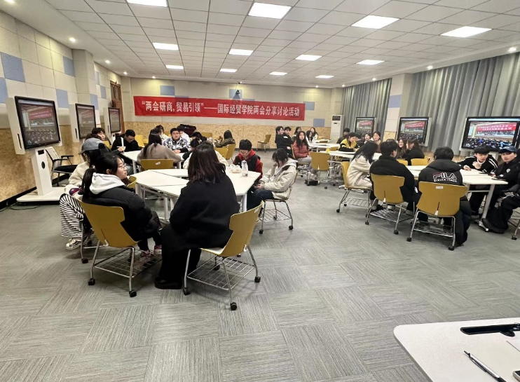参会同学们结合自身经历对两会内容踊跃发言,分享了自己的学习心得。商务2302班班长赵洪鱼对两会中所提出的要更加重视外资的吸引和引用,以营造更加透明、可预期的政策环境这一“观点”印象深刻。紧跟时事把握最新贸易政策,适应国际市场变化和发展的需求是国贸学子扎实专业所学的必然要求,此观点引起了同学们的共鸣和热烈讨论。