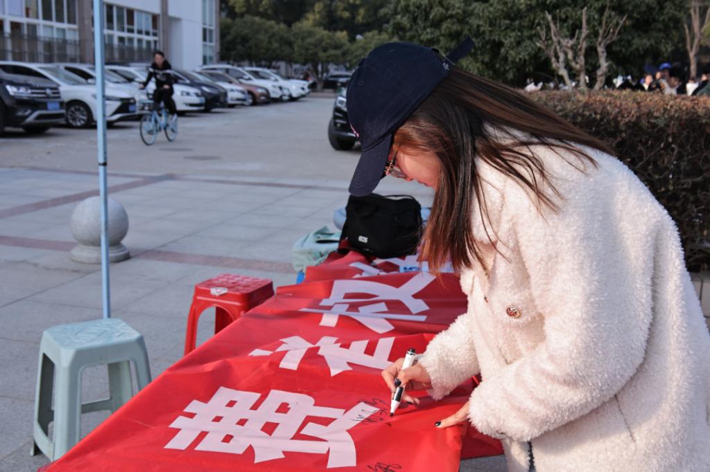 参与活动的同学们在“消费安全,从心开始”主题横幅上写下了对于当下消费环境和消费者维权渠道的建议,并纷纷表示要多学习维权知识,合理安排消费计划,更加舒心、安心、放心地消费。