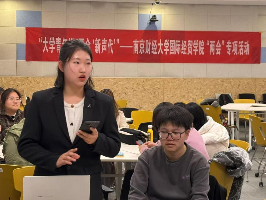在专题讨论环节,同学们围绕多个议题从青年人和财经人的视角提出见解。针对”提振内需“议题,国贸2404班端木佳祺提出通过提高居民收入和优化消费环境能够激发内需潜力,商务2402班刘有为则强调需统筹推进消费升级与有效投资;在“青年实践与担当”议题中,国贸2404班杨涵睿着眼乡村振兴与人工智能领域,呼吁青年应立足国家战略强化专业实践;在"教育改革与人才培养"议题中,国贸2404班邱文佳聚焦教育领域改革,阐释培养创新性人才对产业升级的重要意义。讨论中,同学们一致认为,新时代经贸人才需将政策内涵转化为服务新发展格局的创新能力。