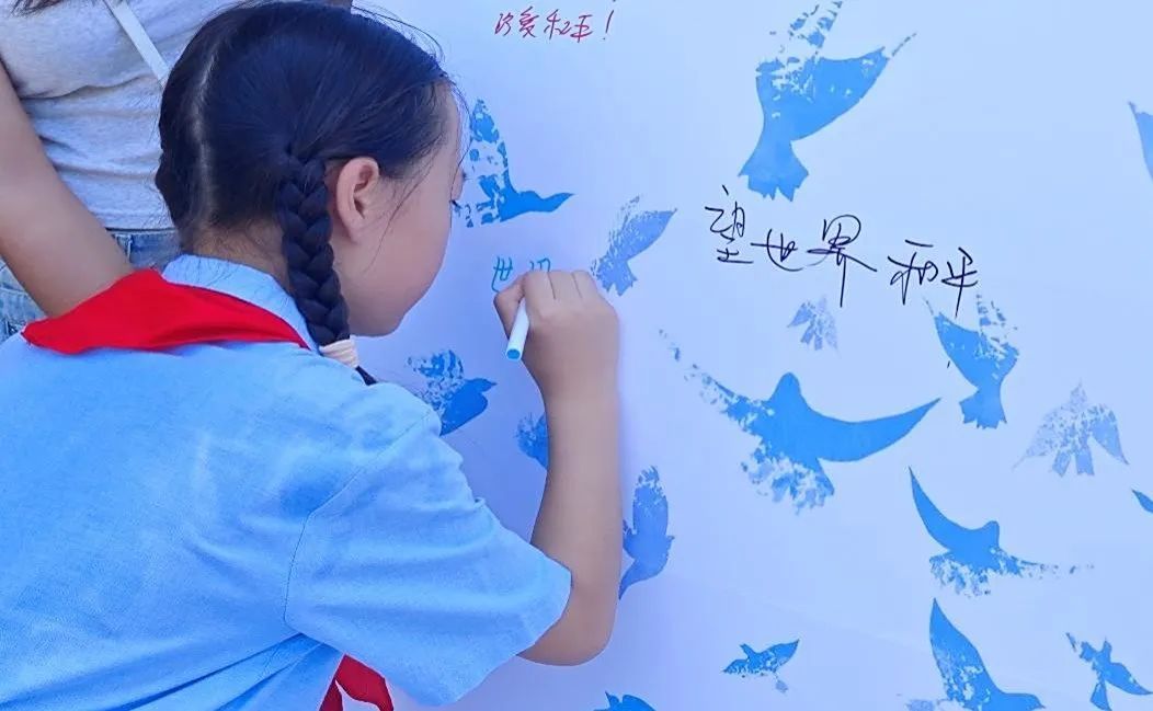 走出展厅,实践团队在馆外设置“鉴史铭初心,执笔书和平”留言板,邀请参观纪念馆的游客、市民写下心得感悟。活动中,不同年龄层的参观者纷纷驻足参与:小员工用稚嫩笔迹写下“希望世界和平”;中年人倾诉对历史的铭记与对和平的珍视;老者则以深沉文字传递爱国与警示之意 。通过留言,我们听到了更多人对历史的铭记、对和平的呼唤,这也让我们的实践更有意义——用行动搭建起传递爱国精神、凝聚和平共识的桥梁。