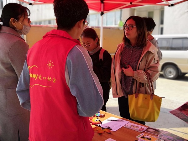 一大早,Sunny爱心协会的成员们便将外场的物资准备齐全,搭好帐篷,摆好漂亮的树叶画和精美的免费午餐的明信片、徽章,静候着有爱心的同学们的到来。成员中一部分守在帐篷里,一部分拿着免费午餐的宣传单页和树叶画成品向来往的路人进行宣传和引导,分工明确,井然有序。同学们看到精美的树叶画后频频驻足询问,在了解到买一片树叶画能向免费午餐基金捐出4元钱,为贫困地区的孩子们送上一顿午餐后,他们纷纷拿起手机向免费午餐捐款。捐款后,Sunny爱心协会将带有免费午餐标志的徽章和明信片赠送给他们,非常有纪念意义。