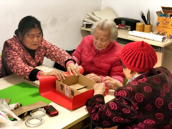 11月23号下午,志愿者们到带着幕府山庄养老社区的老人们将废弃或闲置的盒子变成好看且实用的收纳盒。在将各式各样的快递盒和包装纸分给老人们之后,大家一起开始做收纳盒。杨奶奶一边做一边笑眯眯地和志愿者聊天:“我们家好多这种用不着盒子,平时都不知道要放哪里。你们这些孩子啊,就是有想法,把它们变成洋气的盒子多好看呀。”陈奶奶在志愿者的帮助下做了一个九宫格的收纳盒,做好后陈奶奶开心地转头对志愿者说:“看我们做的盒子,有九个格子!特别适合放在我们家茶几上!”看到老人们十分享受地在做手工,志愿者们也十分享受陪伴老人的时光。志愿者李翼聪同学感慨道:“当一个个简陋的快递盒子穿上五颜六色‘新衣服’,当废弃的盒子变成方便实用的收纳盒,我也想到了我们作为老员工,对待可回收的废弃物应该要有更多的创新想法和惜物意识。”