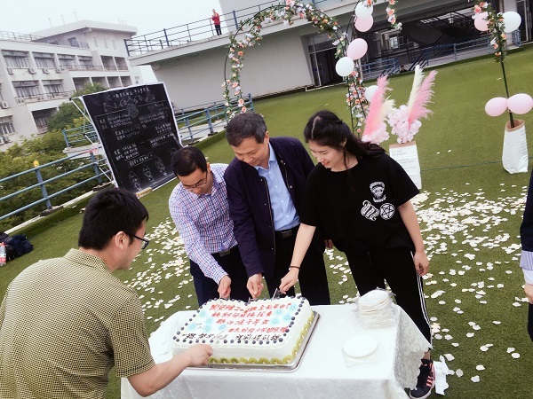 (宣经理,余永泽、杨继军副经理与毕业生一起切蛋糕)