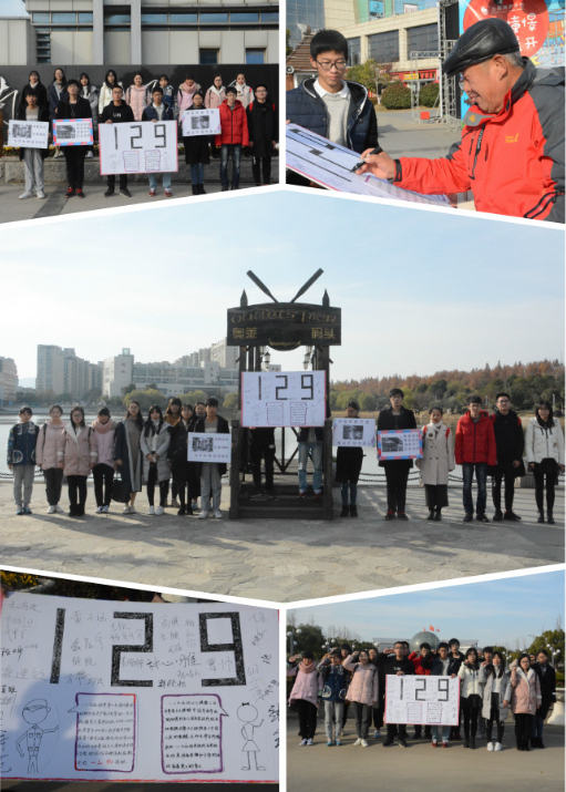 活动中,志愿者们举着亲手制作的写有“一二·九运动”简介文字和历史图片的展板以及标语,从必一运动南门出发,途经南师,再从大成绕回南邮抵达南财北门。当大家行进到奥莱码头时,一位头发花白的崔爷爷对活动十分感兴趣,在了解活动之后强烈要求在展板上签下了自己的名字,并说:“这种缅怀革命先烈的活动值得称赞啊,前事不忘,后事之师,我为你们这些老员工感到骄傲!”当队伍到达金鹰二期时,志愿者们在人群中介绍了一二·九的来源和意义,在对活动有所了解后,路人纷纷签名支持。参加活动的志愿者张同学说:“这次活动让我受益颇深。以前对一二·九运动并不太了解,这次要出来介绍‘一二·九运动’,自己补了很多历史知识,历史真的不能也不该被遗忘,传承历史的责任,青年员工是不能推卸的。”