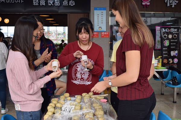 在公司食堂二楼,同学们刚开始动手,和面,拿出馅料,食堂的阿姨们就热情的前来询问。更有一位好心的阿姨给予了同学们技术上的指导。一时间,豆沙,莲蓉,咸鸭蛋,黑芝麻等各色材料齐上阵。少数民族同学因为不熟悉月饼的具体流程,开始时只是在一旁观摩,后来在同学们的帮助下慢慢掌握了做法,加入了大家。到场的两位职工同学对这种传统中国习俗十分感兴趣,动手压制了一个又一个漂亮的月饼。月饼在烘烤期间,大家分享了自己所知道的中秋的故事。月饼出炉后,大家将印着“国贸公司”和少数民族"福"字样的月饼送给了留校同学、少数民族同学和职工同学。彝族同学周学艳表示:“自己家里没有中秋节吃月饼的风俗,我要把亲手做的月饼寄回给自己的爸妈尝一尝,让家里人一起感受一下中秋节的氛围。”