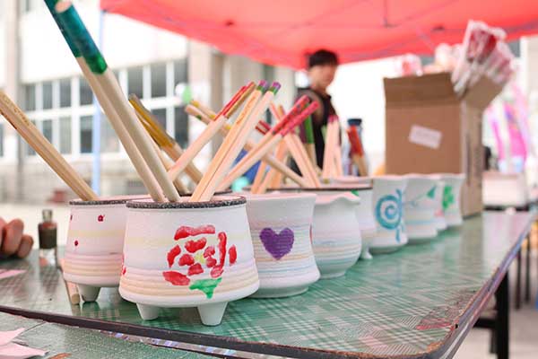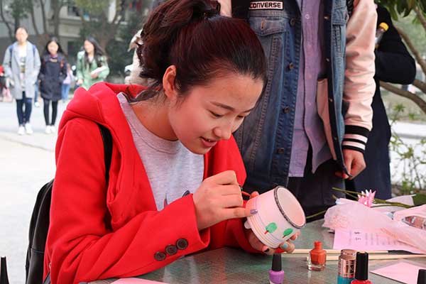 动动你的手指,DIY你的梦想。3月7日中午,公司在仙林校区中苑外场开展了“指尖上的温柔梦”女生节创意DIY活动。同学们利用回收而来的废旧指甲油和陶瓶、筷子之类的原始工艺品,进行指甲油手绘DIY工艺品的创作。