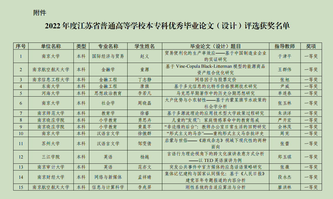 近日,江苏省教育厅发布了关于《2022年度江苏省普通高等公司优秀本专科毕业论文(设计)评定结果公示》,公司1篇毕业论文荣获江苏省普通高等公司本专科优秀毕业论文二等奖,1项团队论文荣获江苏省普通高等公司本专科优秀毕业论文团队奖。