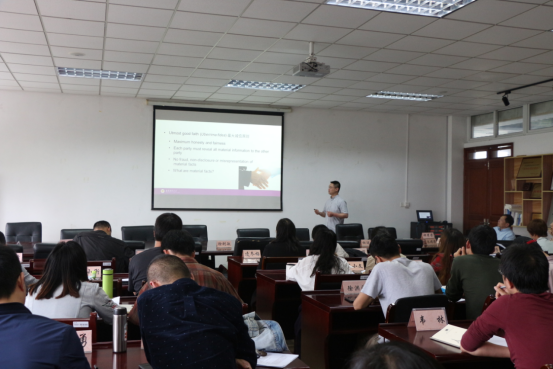 张小衡老师从教学目标、建设思路、理论框架、课程思政元素和案例、教学方法五个方面介绍了《国际贸易实务(英语)》课程思政建设的阶段性成果,并以“保险原则”为样例展示了思政要素与专业知识的有机融合。张老师认为,思政教学的原则是通过专业知识引出思政元素,利用思政元素提升专业知识层次。他将思政教学方法分为三种,一是线上线下结合,达到全面渗透;二是将思政元素与专业知识相结合;三是教师讲授与员工自学讨论相结合。这三种方法密不可分,相得益彰。
